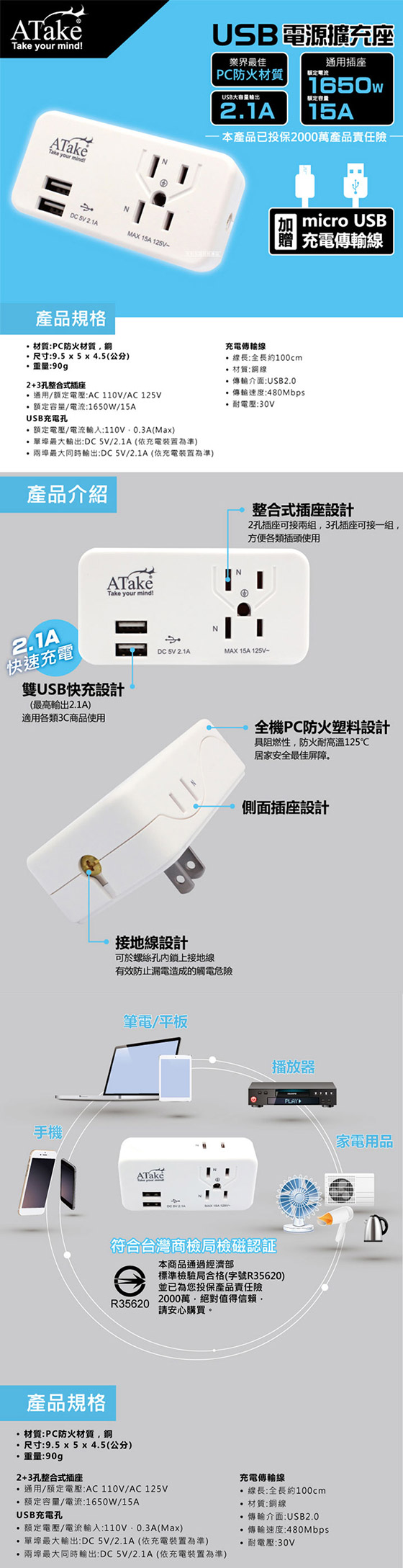 我買東西的習慣都會先上網查看看相關的資訊看到這個Atake-3座2+3孔USB 2.1A電源擴充座"好像不錯